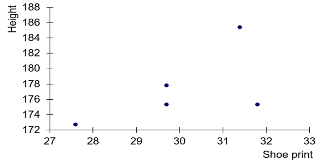 As the scatterplot only reveals an upward trend and no specific association, the shoe print length cannot be used for estimating the height ofmales.