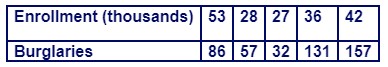 The following exercises are based on the following sample data consisting of numbers of enrolled students (in thousands) and numbers of burglaries for randomly selected large colleges in a recent year (based on data from the New York Times).