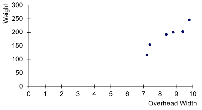 measured from photographs and the weights (kg) of the seals (based on 鈥淢ass Estimation of Weddell Seals Using Techniques of Photogrammetry,鈥 by R. Garrott of Montana State University). The purpose of the study was to determine if weights of seals could be determined from overhead photographs. Is there sufficient evidence to conclude that there is a linear correlation between overhead widths of seals from photographs and the weights of the seals?