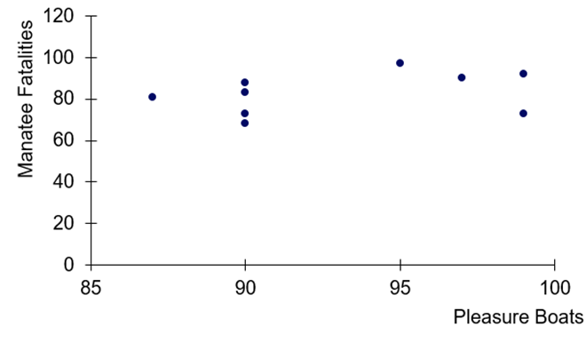Manatees Listed below are numbers of registered pleasure boats in Florida (tens of thousands) and the numbers of manatee fatalities from encounters with boats in Florida for each of several recent years. The values are from Data Set 10 鈥淢anatee Deaths鈥 in Appendix B. Is there sufficient evidence to conclude that there is a linear correlation between numbers of registered pleasure boats and numbers of manatee boat fatalities?