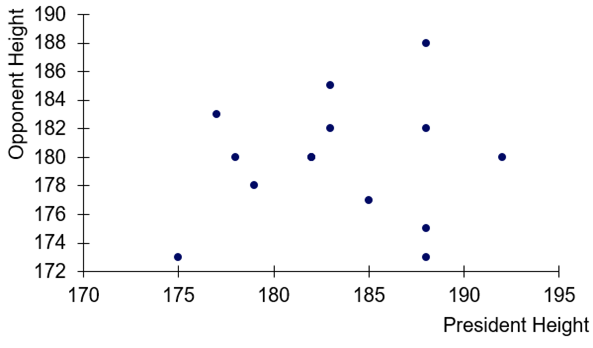 POTUS Media periodically discuss the issue of heights of winning presidential candidates and heights of their main opponents. Listed below are those heights (cm) from severalrecent presidential elections (from Data Set 15 鈥淧residents鈥 in Appendix B). Is there sufficient evidence to conclude that there is a linear correlation between heights of winning presidential candidates and heights of their main opponents? Should there be such a correlation?