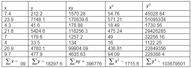 \(\begin{array}{c}r = \frac{{n\left( {\sum {xy} } \right) - \left( {\sum x } \right)\left( {\sum y } \right)}}{{\sqrt {\left( {\left( {n\sum {{x^2}} } \right) - {{\left( {\sum x } \right)}^2}} \right)\left( {\left( {n\sum {{y^2}} } \right) - {{\left( {\sum y } \right)}^2}} \right)} }}\\ = \frac{{8\left( {396776} \right) - \left( {99} \right)\left( {18297.6} \right)}}{{\sqrt {\left( {\left( {8 \times 1715.6} \right) - {{\left( {99} \right)}^2}} \right)\left( {\left( {8 \times 103679501} \right) - {{\left( {18297.6} \right)}^2}} \right)} }}\\ = 0.9782\end{array}\)