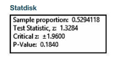 Using Technology. In Exercises 5鈥8, identify the indicated values or interpret the given display. Use the normal distribution as an approximation to the binomial distribution, as described in Part 1 of this section. Use = 0.05 significance level and answer the following: