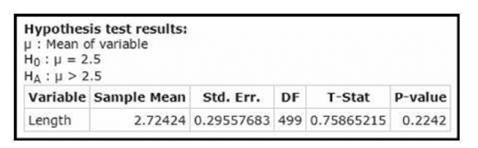 Tornadoes Data Set 22 鈥淭ornadoes鈥 in Appendix B includes data from 500 random tornadoes. The accompanying StatCrunch display results from using the tornado lengths (miles) to test the claim that the mean tornado length is greater than 2.5 miles.