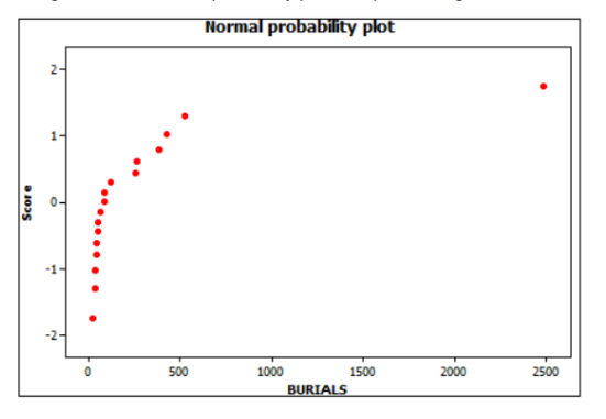 The sample size is moderate (n = 17). We can see that there is an outlier in the data from the graphical representations, and the probability plot isn't even close to linear. As a result, using the t-interval technique on the supplied data is not a good idea.
