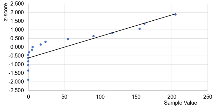c.The following normal quantile plot is constructed for the sample of times of tobacco use for the given 17 non-Disney movies: