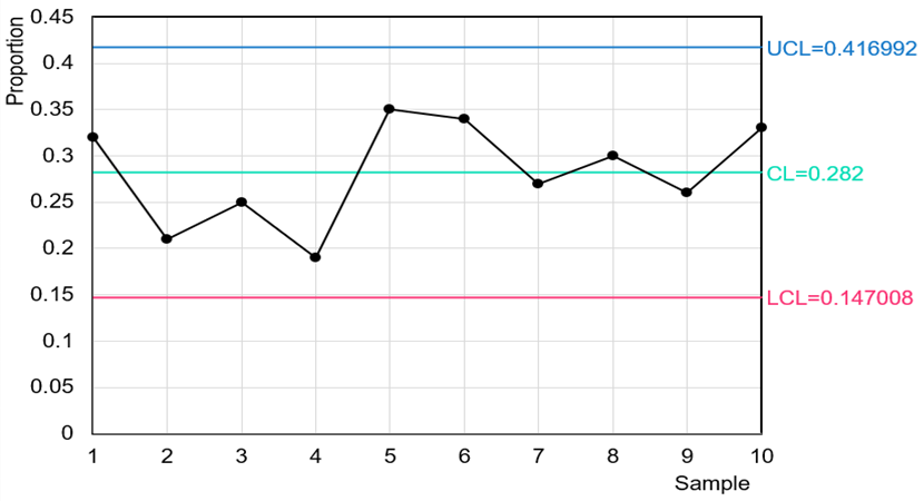 The following p chart is constructed for the proportions of defective coins: