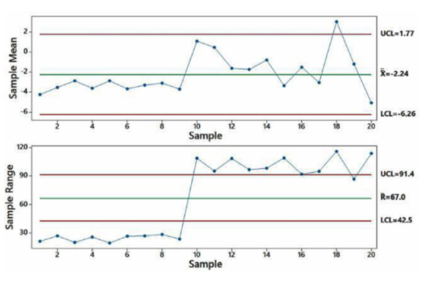 In Exercises 5–8, use the following two control charts that result from testing batches of newly manufactured aircraft altimeters, with 100 in each batch. The original sample values are errors (in feet) obtained when the altimeters are tested in a pressure chamber that simulates an altitude of 6000 ft. The Federal Aviation Administration requires an error of no more than 40 ft at that altitude.