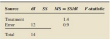 Fill in the missing entries in the partially completed one-way ANOVA table