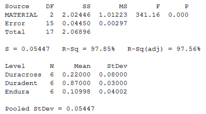 Artificial Teeth: Wear. In a study by J. Zeng et al. three materials for making artificial teeth-Endura, Duradent, and Duracross-were tested for wear. Their results were published as the paper "In Vitro Wear Resistance of Three Types of Composite Resin Denture Teeth" (Journal of Prosthetic Dentistry, Vol. 94 . Issue 5. pp. 453-457 ). Using a machine that simulated grinding by two right first molars at 60 strokes per minute for a total of 50,000 strokes, the researchers measured the volume of material worn away, in cubic millimeters. Six pairs of teeth were tested for each material. The data on the WeissStats site are based on the results obtained by the researchers. At the 5 % significance level, do the data provide sufficient evidence to conclude that there is a difference in mean wear among the three materials?