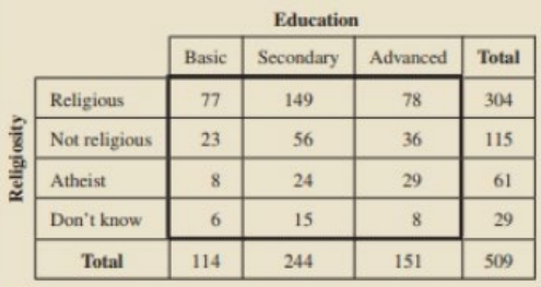 a. At the 5% significance level, do the data provide sufficient evidence to conclude that an association exists between religiosity and education?