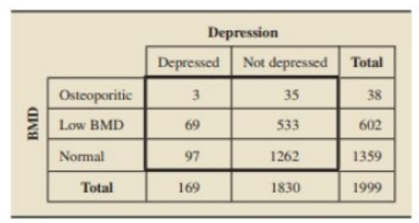 BMD and Depression. In the paper "Depression and Bone Mineral Density: Is There a Relationship in Elderly Asian Men? (Osteoporosis International, Vol. 16, pp. 610-615), S. Wong et al. published results of their study on bone mineral density (BMD) and depression for 1999 Hong Kong men aged 65 to 92 years. Here are the cross-classified data.