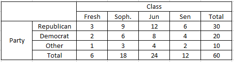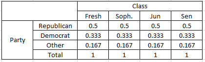 Part (e): Without doing further calculation, respond true or false to the following statement and explain your answer: "The conditional distributions of class level within political party affiliations are distributions of class level within political party affiliations are identical to each other and to the marginal distribution of class level."