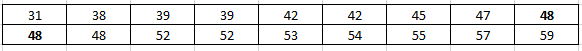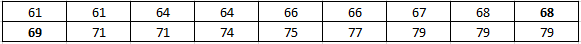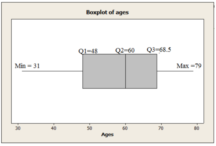 Part (c): The five-number summary of the data is the minimum age is 31yrs, first quartile is 60yrs and third quartile is 68.5yrs and maximum age is 79yrs.