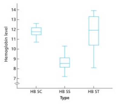 Sickle Cell Disease. A study published by E. Anionwu et al. in the British Medical Journal (Vol. , pp. ) examined the steady-state hemoglobin levels of patients with three different types of sickle cell disease: HB SC. HB SS. and HB ST. Use the following boxplots to compare the hemoglobin levels for the three groups of patients, paying special attention to center and variation.