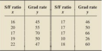 US News and World Report's "College Guide" provides data on graduation rates for colleges and universities as a function of the per centage of freshmen in the top 10% of their high school class, total spending per student, and student-to-faculty ratio. A random sample of 10 universities gave the following data on student-to-faculty ratio (S/F ratio) and graduation rate (Grad rate).