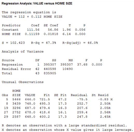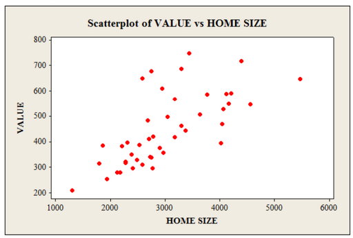 The data from Exercise 4.74 for home size in (square feet) and assessed values (in thousands of dollars) for the same homes as in Exercis 4.107 are on the WeissStats site.
