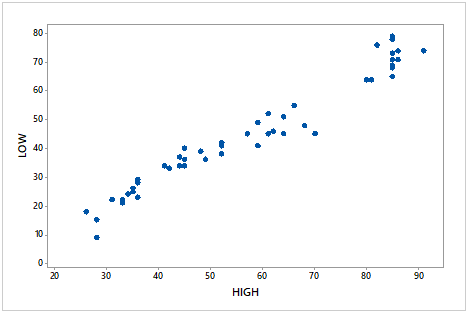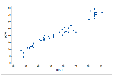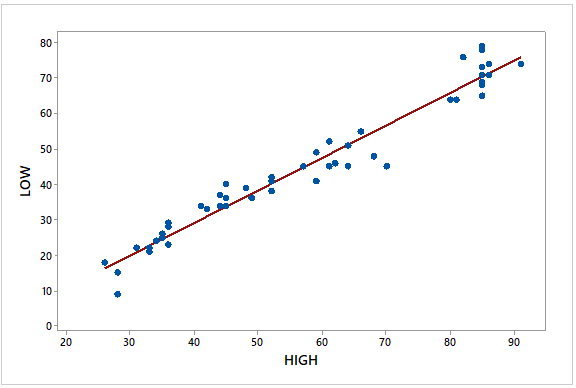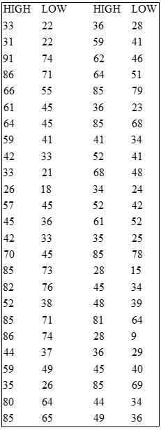The National Oceanic and Atmosphere Administration publishes temperature information of cities around the world in Climates of the World. A random sample of \(50\) cities gave the data on average high and low temperatures in January shown on the WeissStats in the site.