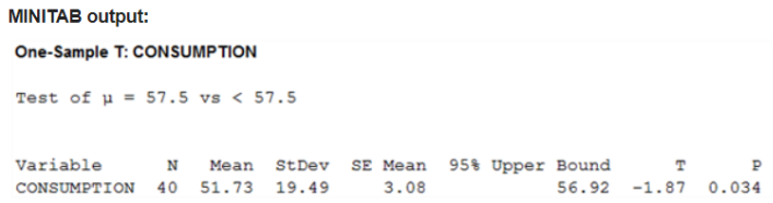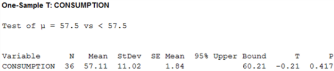 b. Decide, at the 5% significance level, whether last year's mean beef consumption is less than the 2011 mean of 57.5 lb. Apply the one mean t-test.