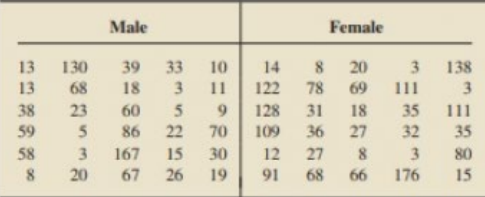 In the paper "The Relation of Sex and Sense of Direction to Spatial Orientation in an Unfamiliar Environment" (Journal of Environmental Psychology, Vol. 20, pp. 17-28), J. Sholl et al. published the results of examining the sense of direction of 30 male and 30 female students. After being taken to an unfamiliar wooded park, the students were given some spatial orientation tests, including pointing to the south, which tested their absolute frame of reference. The students pointed by moving a pointer attached to a protractor. Following are the absolute pointing errors, in degrees, of the participants.