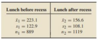 Recess and Wasted Food, E. Bergman et al. conducted a study to determine, among other things, the impact that scheduling recess before or after the lunch period has on wasted food for students in grades three through five. Results were published in the online article "The Relationship of Meal and Recess Schedules to Plate Waste in Elementary Schools" (Journal of Child Nutrition and Management, Vol. 28, Issue 2). Summary statistics for the amount of food wasted, in grams, by randomly selected students are presented in the following table.