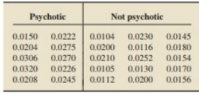 in the brain, maybe a causative factor for schizophrenia. In the paper "Schizophrenia: Dopamine -Hydroxylase Activity and Treatment Response" (Science, Vol. 216, pp. 1423-1425), D. Sternberg et al. published the results of their study in which they examined schizophrenic patients who had been classified as either psychotic or not psychotic by hospital staff. The activity of dopamine was measured in each patient by using the enzyme dopamine -hydroxylase to assess differences in dopamine activity between the two groups. The following are the data, in nanomoles per milliliter-hour per milligram ( .