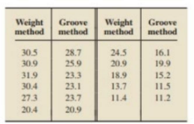Measuring Treadwear. R. Stichler et al. compared two methods of measuring treadwear in their paper "Measurement of Treadwear of Commercial Tires" (Rubber Age, Vol. 73:2). Eleven tires were each measured for treadwear by two methods, one based on weight and the other on groove wear. The data, in thousands of miles, are as follows.