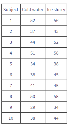 Cooling Down. Cooling down with a cold drink before exercise in the heat is believed to help an athlete perform. Researcher 1. Dugas explored the difference between cooling down with an ice slurry (slushy) and with cold water in the article "lce Slurry Ingestion Increases Running Time in the Heat" (Clinical Journal of Sports Medicine, Vol. 21, No, 6, pp. 541-542). Ten male participants drank a flavored ice slurry and ran on a treadmill in a controlled hot and humid environment. Days later, the same participants drank cold water and ran on a treadmill in the same bot and humid environment. The following table shows the times, in minutes, it took to fatigue on the treadmill for both the ice slurry and the cold water.