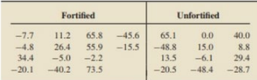 V. Tangpricha et al. did a study to determine whether fortifying orange juice with Vitamin D would result in changes in the blood levels of five biochemical variables. One of those variables was the concentration of parathyroid hormone (PTH), measured in picograms/milliliter ( pg/ml ). The researchers published their results in the paper "Fortification of Orange Juice with Vitamin D: A Novel Approach for Enhancing Vitamin D Nutritional Health" (American Journal of Clinical Nutrition, Vol. 77, pp. 1478-1483). Concentration levels were recorded at the beginning of the experiment and again at the end of weeks. The following data, based on the results of the study, provide the decrease (negative values indicate an increase) in PTH levels, in pg/ml, for those drinking the fortified juice and for those drinking the unfortified juice.