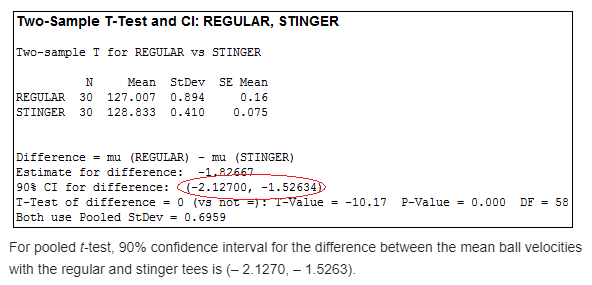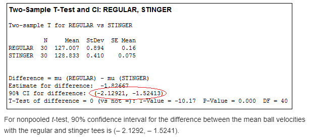 d. Find a \(90%\) confidence interval for the difference between the mean ball velocities with the regular and Stinger tees. Obtain the reuiqred confidence interval by using both the poold \(t-\)interval procedure and the nonpooled \(t-\)interval procedure. Compare your results.