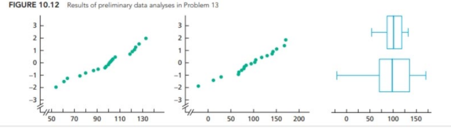 Each of Problems 12-17 provides a type of sampling (independent or paired), sample size(s), and a figure showing the results of preliminary dafa analyses on the sample(s). For independen samples, the graphs are for the nwo samples; for a paired sample, the graphs are for the paired differences. The intent is to employ the sample data fo perform a hypothesis test to compare the means of the two populations from which the duta were obtained. In each case, decide which if ary; of the procedures that you have studied should be applied.