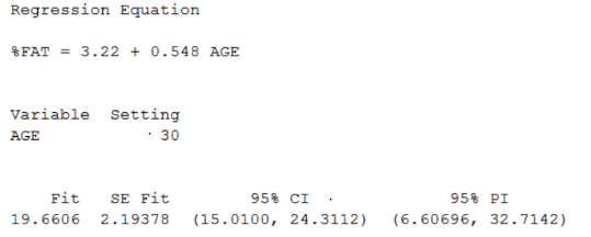 Body Fat. The data from Exercise 14.80 for age and body fat of 18 randomly selected adults are on the WeissStats site. Specified value of the predictor variable: 30 years.