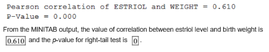 Obtain the correlation and -value between estriol level and birth weight by using MINITAB.