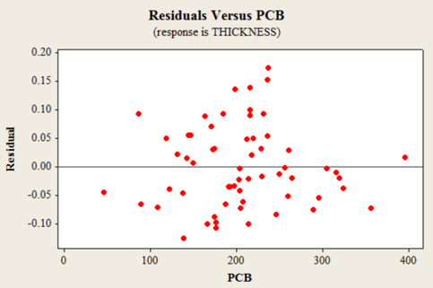 a). As a result, for the variables thickness and PCB, the assumption for regression inferences is not broken.