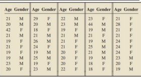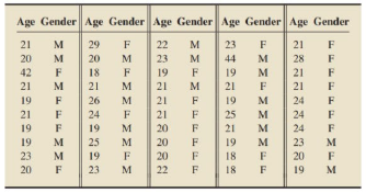 The following bivariate data on age (in years) and gender were obtained from students in a freshman calculus course. The data show, for example that the first student on the list is \(21\) years old and is a male.