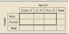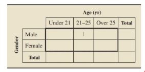 a. Group these data in the following contingency table. For the first student, place a tally mark in the box labeled by the "\(21-25\)" column and the "Male" row, as indicated. Tally the data for the other \(49\) students.