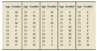 The following bivariate data on age (in years) and gender were obtained from students in a freshman calculus course. The data show, for example that the first student on the list is \(21\) years old and is a male.