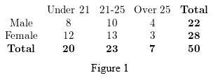 a. Group these data in the following contingency table. For the first student, place a tally mark in the box labeled by the "\(21-25\)" column and the "Male" row, as indicated. Tally the data for the other \(49\) students.