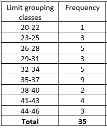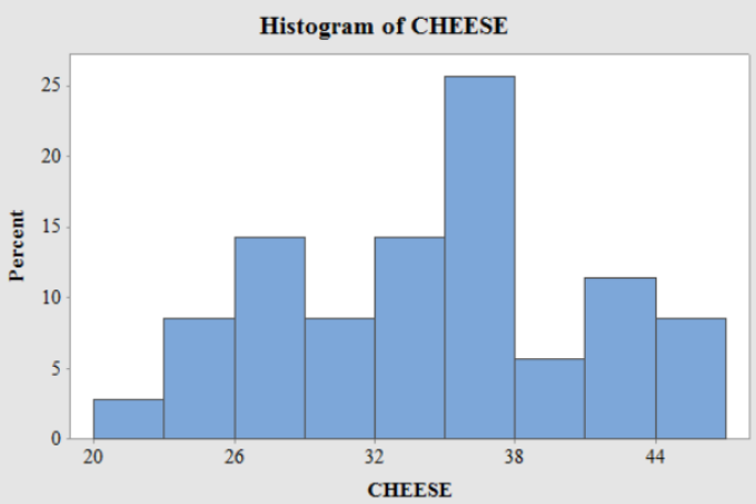 The U.S. Department of Agriculture reports in Food Consumption, Prices and Expenditures that the avrage American consumed about 33.5lbof cheese in 2011. Cheese consumption has increased steadily since 1960, when the average American ate only 8.3lb of cheese annually. The following table provides last year's cheese consumption, in pounds, for 35 randomly selected Americans. Use limit grouping with a first class of 20-22 and a class width of 3.