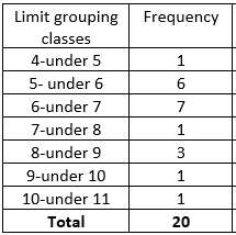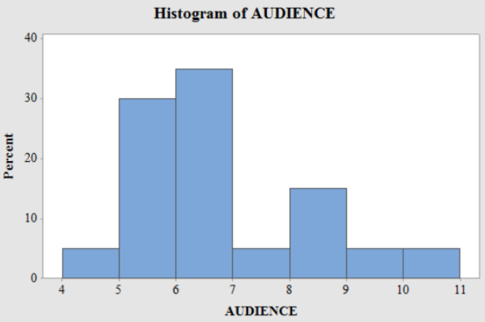 From the TVbytheNumbers website, we obtain the viewing audiences, in millions, for the top 20 primetime broadcast TV shows for the week ending August 18,2013. Use cutpoint grouping with a first class of 4-under 5.