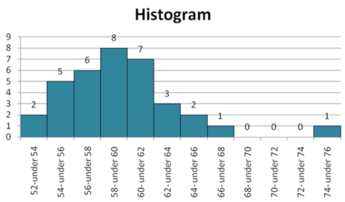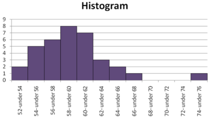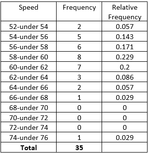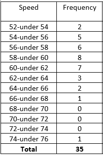 The cheetah is the fastest land mammal and is highly specialized to run down prey. The cheetah often exceed speeds of 60mph and according to the online document "Cheetah Conservation in Southern Africa" by J. Urbaniak, the cheetah is capable of speeds up to 72mph.The following table gives the speeds, in miles per hour, over mile for 35cheetahs. Use cutpoint grouping with 52as the first cutpoint and classes of equal width 2.
