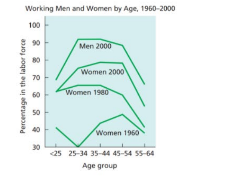 c. Not covering up the vertical axis, we would find that the percentage of woman in the labor force for 2000 is about 3.8 times that for 1960