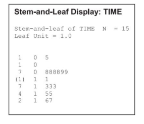 The following Minitab output shows a stem-and-leaf diagram for these data. The second column gives the stems, and the third column gives the leaves.