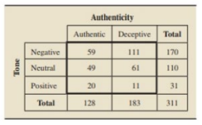 In the article "When News Reporters Deceive: The Production of Stereotypes", researchers D. Lasorsa and J. Dai investigated the relationship between authenticity and tone for news stories. Tone was measured by using a method of coding sentences and was categorized as positive, neutral or negative. A sample of stories yielded the following data.