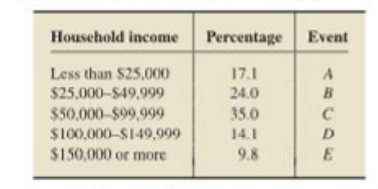 Suppose that a U.S household with Internet access is selected at random. Let A denote the event that the household has an income under \(25,000 and 49,000, and so on (see the third column of the table). Apply the special addition rule to find the probability that the household obtained has an income.