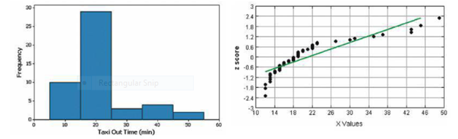 Normality Assessment A random sample consists of 48 times (min) required for American Airlines flights to taxi out for takeoff. All of the flights are American Airlines flights from New York (JFK) to Los Angeles and they all occurred in January of a recent year. The 48 taxi-out times are depicted in the histogram and normal quantile plot shown below. Based on those graphs, does it appear that the taxi-out times are from a population having a normal distribution? Give an explanation for the distribution shown. Do the taxi-out times appear to satisfy the requirements necessary for construction of a confidence interval estimate of the standard deviation of the population of all such times?