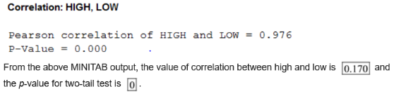 Obtain the correlation and p-value between high and low by using MINITAB.