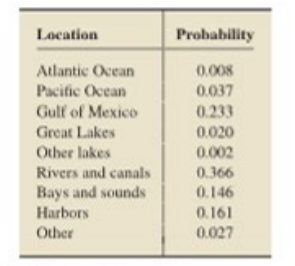 Oil Spills. The U.S Coast Guard maintain a database of the number source, and location of oil spills in U.S navigable and territorial waters, The following in a probability distribution for location of oil events. [ SOURCE: Statistical Abstract of the United states]