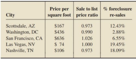 Home Sales. Zillow.com is an online database that provides real estate information for U.S. homes that are for rent or sale. It also presents statistics on recently sold homes. The following table gives various information on all homes sold in several different cities across the United States for the month of September 2012.