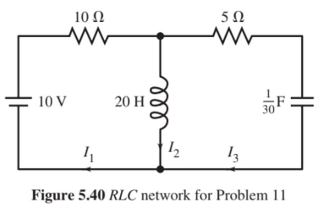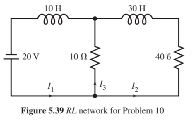 Find a system of differential equations and initial conditions for the currents in the networks given in the schematic diagrams (Figures \({\bf{5}}{\bf{.39 - 5}}{\bf{.42}}\) on pages\({\bf{294 - 295}}\)). Assume that all initial currents are zero. Solve for the currents in each branch of the network.